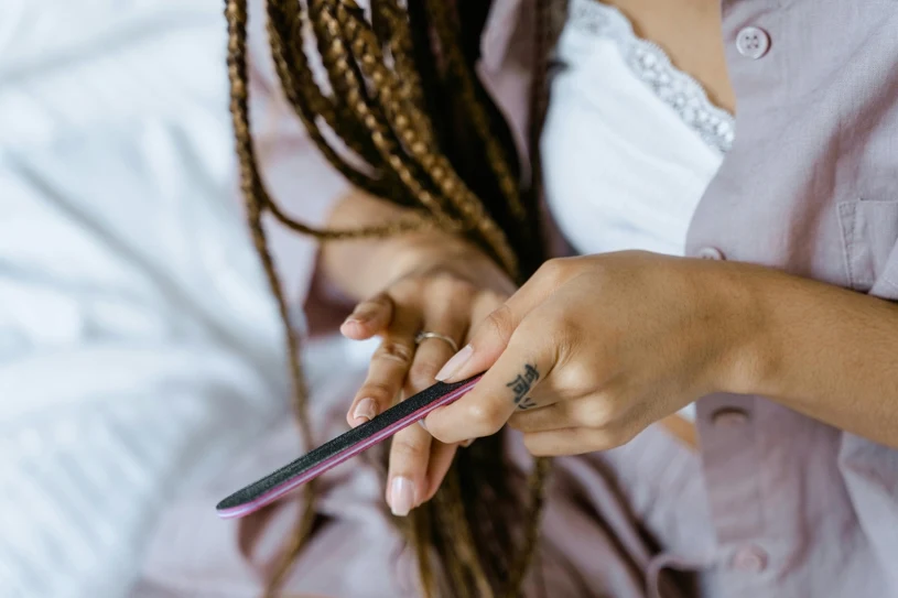 - Spiłuj paznokcie w jednym kierunku drobnoziarnistym pilnikiem, nadając im krótki, wygodny kształt, który mniej naraża płytkę na urazy.